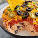 Scatter sliced black olives and chopped green onions over the cheese for that last burst of flavor and color. These toppings offer a salty, fresh crunch that’s just irresistible. Then, serve it up with plenty of tortilla chips for dipping!