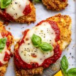 A crispy and flavorful Air Fryer Chicken Parmesan recipe featuring tender chicken breasts coated with Parmesan and panko breadcrumbs, topped with marinara sauce and melted mozzarella cheese. This healthier version uses an air fryer to get the perfect golden crust quickly and easily, garnished with fresh basil for a vibrant finish.