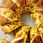 A delicious crescent breakfast ring featuring scrambled eggs with red and green bell peppers, crispy bacon, and melted cheddar cheese all wrapped in flaky crescent roll dough. Perfect for a savory breakfast or brunch that looks impressive yet is easy to prepare.