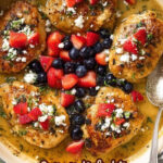 - Reintroduce chicken and finish: Return the seared chicken pieces to the skillet, spoon sauce over them, and cook for 2-3 minutes until heated through. Remove from heat and top with blueberries, diced strawberries, and crumbled feta cheese.