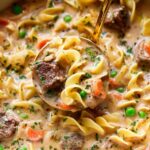 A rich and satisfying Beef Noodle Soup featuring tender seared sirloin cooked in a savory broth with vegetables, thickened with a creamy half and half mixture, and served with perfectly cooked egg noodles. This comforting soup combines slow-baked beef with aromatic herbs and fire-roasted tomatoes, making it a perfect meal for cool days.