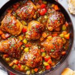 A flavorful Jamaican Brown Stew Chicken recipe featuring tender marinated chicken thighs simmered with aromatic vegetables and spices in a rich, thickened gravy. Perfectly seasoned and ideal for serving with rice and peas or plantains.