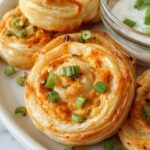 These Buffalo Chicken Pinwheels are a flavorful appetizer combining shredded chicken, cream cheese, Greek yogurt, mozzarella, and spicy buffalo sauce wrapped in flaky puff pastry. Perfectly golden and easy to make, they are great for parties or snacks.