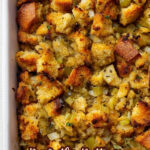 Our Favorite Buttery Herb Stuffing is a classic holiday side dish featuring toasted bread cubes mixed with sautéed onions, celery, garlic, fresh herbs, and rich butter, baked until golden and flavorful. Perfect for serving 8 to 12 people, this stuffing can be made ahead and reheated or used to stuff your bird.