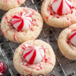 Into a preheated 375°F oven they go for about 10 minutes — you’ll know they’re ready when the centers are just set but still soft. After cooling for 5 minutes, I press an unwrapped Hershey’s Candy Cane Kiss gently into the center of each warm cookie. The residual heat softens the chocolate just right.