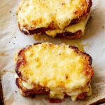 Classic French Croque Monsieur sandwich featuring layers of ham and Gruyere cheese with a creamy béchamel sauce, pan-fried to golden perfection and finished under the broiler for a rich, cheesy crust.