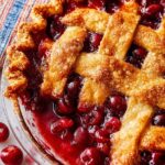 This classic sour cherry pie features a tangy and sweet filling made from frozen tart cherries thickened with cornstarch and a hint of warm spices, all encased in a flaky homemade pie crust with a beautiful lattice top. Perfectly baked to a golden brown, it's an ideal summer dessert served best with vanilla ice cream.