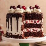 - Assemble Cake: Place one cake layer upside down on a serving stand. Brush generously with cherry syrup. Spread a thick layer of whipped cream, scatter one-third of chopped cherries into it, and drizzle 2-3 tbsp ganache. Repeat for next two layers.