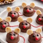Chocolate Cherry Mice are adorable, festive treats made by wrapping maraschino cherries in a soft almond-flavored dough, dipping them in melted milk chocolate, and decorating them with Hershey's Kisses for heads, almond slices for ears, and icing details for eyes and nose. These charming confections are perfect for holiday parties or whimsical dessert tables.