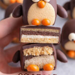 Dip a Nutter Butter cookie fully into the chocolate mixture, then gently lift it out with a fork and give it a little shake to discard excess chocolate. Place it onto a parchment-lined surface or wire rack to set. While the chocolate is still soft, add a mini Nilla wafer right in the middle for the tummy. Place two candy eyes on the upper part, then press half an orange Reese's piece (cut side down) for the nose. Add two more orange halves horizontally below the wafer for feet, and finish by pressing one brown Reese’s piece on each side to form the wings. Repeat with all cookies—this step is almost like crafting tiny chocolate masterpieces!