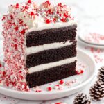 A festive and moist Chocolate Peppermint Cake featuring rich cocoa layers infused with peppermint, layered and frosted with a smooth Peppermint Swiss Meringue Buttercream decorated with crushed candy canes and festive piping.
