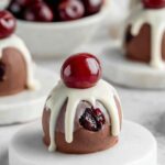 - Decorate: Once all truffles are coated and chilled, use a small amount of the cooled white chocolate to dot the top of each truffle and immediately place a halved glacé cherry on top.