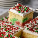 - Decorate and serve: Before serving, sprinkle the top with red and green sprinkles or decorations to enhance the festive look. Cut into pieces and enjoy this vibrant holiday dessert.