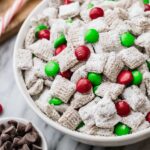 Christmas Puppy Chow is a festive and delicious snack mix featuring a chocolate-peanut butter coating over crunchy rice Chex cereal, dusted with confectioners sugar and studded with holiday M&M’s. This easy no-bake treat is perfect for holiday parties and gift-giving.