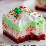 A festive and delicious Christmas Lasagna Dessert featuring layers of red velvet cake, creamy peppermint cream cheese, vibrant green vanilla pudding, and whipped topping, perfect for holiday celebrations.