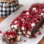 This festive Christmas Rocky Road combines rich semi-sweet chocolate, creamy almond butter, crunchy roasted almonds, tart dried cranberries, and soft mini marshmallows, all spiced with warming holiday flavors and topped with fresh pomegranate seeds. Perfect for holiday treats, this no-bake candy bar offers a delightful mix of textures and flavors, ideal for gifting or celebrating.