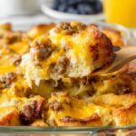 A hearty and festive Christmas Breakfast Casserole featuring savory ground pork sausage, eggs, sharp cheddar cheese, and day-old bread soaked overnight for a perfect morning meal during the holidays.