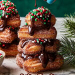 Celebrate the holidays with festive Christmas Tree Churros, golden fried dough shaped into stacked circles resembling a Christmas tree, coated in cinnamon sugar, and topped with a rich chocolate ganache and colorful sprinkles. This fun and delicious treat makes a perfect holiday dessert or snack.