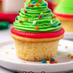 Celebrate the holidays with these delightful Christmas Tree Cupcakes featuring moist vanilla cake topped with green buttercream frosting piped to resemble a festive tree, decorated with colorful sprinkles and Twizzler candy for a fun and festive treat.