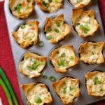 - Bake filled cups: Bake the filled wonton cups at 350°F until the filling is warmed through and bubbly, about 12 minutes.