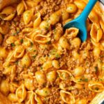 Creamy Beef and Shells is a comforting and hearty pasta dish featuring ground beef simmered in a flavorful tomato and cream cheese sauce, combined with tender shell pasta and plenty of shredded cheddar cheese for a rich, creamy finish. Garnished with fresh parsley and Parmesan cheese, this dish is perfect for a satisfying dinner.
