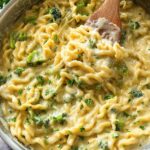This creamy Cheese Pasta recipe features a flavorful sauce made with chicken broth, half and half, and a blend of seasonings, combined with finely chopped broccoli and gemelli pasta. Topped with sharp cheddar and Parmesan cheeses, it is a comforting, cheesy dish perfect for a quick dinner.
