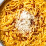 A comforting and creamy butternut squash pasta dish featuring roasted vegetables blended into a smooth sauce, tossed with al dente pasta, crispy pancetta, and topped with parmesan cheese and fresh parsley.