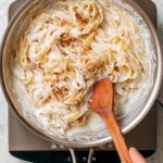 - Cook the pasta: Boil salted water in a large pot and cook fettuccine following package instructions aiming for al dente. Drain and transfer pasta to the skillet with caramelized onions.