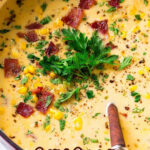 This hearty Potato Corn Chowder features crispy bacon, tender red potatoes, sweet corn kernels, and a creamy broth enriched with butter and heavy cream. Perfect as a comforting main dish, this chowder combines smoky, savory flavors with a smooth, velvety texture, garnished with shredded cheese and fresh parsley or scallions for a delicious finish.