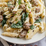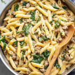 Stir in fresh baby spinach until it wilts down, then return the cooked sausage to the sauce and combine. Finally, add your drained pasta and toss until everything is luxuriously coated. At this point, give it a quick taste and adjust salt or pepper as needed.