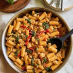 This creamy tomato pesto pasta with chicken is a delicious and comforting dish that combines tender rigatoni pasta with a savory sauce made from tomato sauce, pesto, light cream, and roasted red peppers. Served with juicy seared chicken and topped with fresh burrata cheese and spinach, it’s a perfect meal for a cozy dinner or special occasion.
