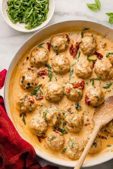 I can’t get enough of these meatballs — they’re the perfect balance of juicy chicken and that luscious creamy Tuscan sauce that just makes every bite sing. Plus, they come together in just over half an hour!