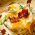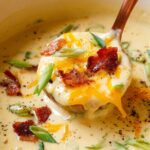 I’m a huge fan of topping this soup with the crispy bacon pieces from the recipe plus shredded sharp cheddar and a handful of sliced green onions for a pop of freshness. Sometimes I like to melt a little butter on top too—it just adds that cozy, indulgent feel with every spoonful.