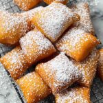 Classic French-style beignets, light and airy fried dough squares dusted with powdered sugar. Perfect as a sweet breakfast treat or dessert, these beignets have a slightly crisp exterior and soft, fluffy interior.
