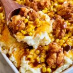 A comforting and hearty mashed potato casserole topped with crispy chicken tenders, sweet corn, cheddar cheese, and brown gravy. This easy-to-make dish combines creamy mashed potatoes with flavorful toppings baked to perfection for a satisfying family meal.