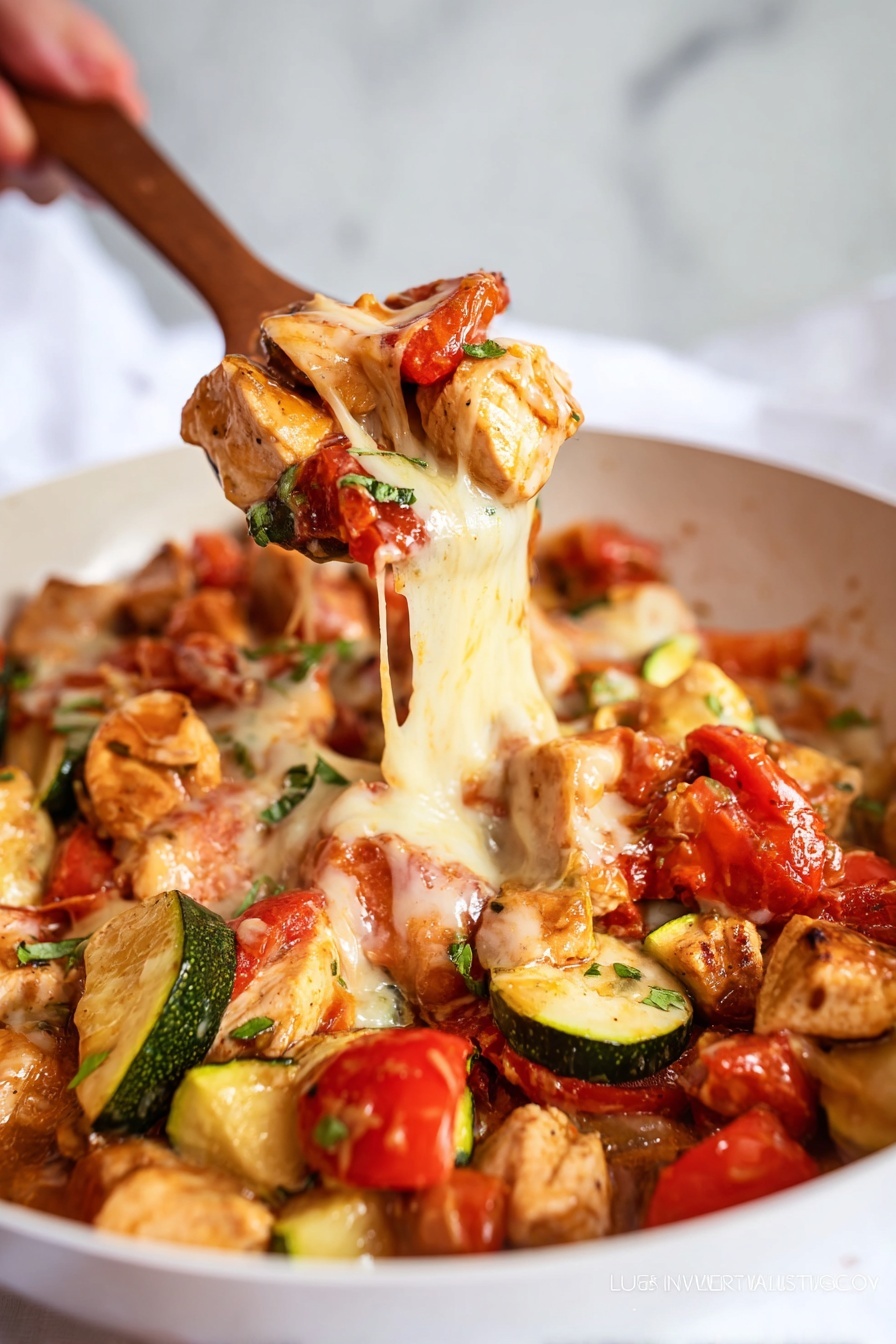 Gently scatter the mozzarella balls evenly over the chicken and veggies. Cover the pan with a lid and let it sit for a few minutes. This steam trick melts the cheese perfectly until it’s gooey and indulgently stretchy—a signature of this Crispy Zucchini Chicken Caprese Recipe.