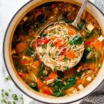 - Add Noodles and Vegetables: Add the rice noodles and chopped red bell pepper to the pot. Simmer for 2 minutes. Turn off the heat, then add the baby bok choy, shredded chicken, and the miso mixture. Cover the pot and let sit for 1-2 minutes to allow the noodles to become al dente and the bok choy to wilt. Do not boil or continue simmering after adding the miso, as this will ruin the texture.