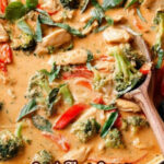 This vibrant Thai Curry recipe features tender chicken thighs cooked in a fragrant red curry sauce with fresh vegetables, coconut milk, and a balance of savory, sweet, and tangy flavors. Perfect for a quick and flavorful weeknight dinner, it is garnished with fresh herbs and lime to elevate the dish.