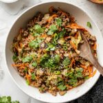 - Serve and Garnish: Portion the egg roll mixture into bowls. Top with sliced green onions, sesame seeds, and chopped cilantro. Optionally, serve with extra sriracha or chili crisp, and cooked cauliflower rice for a complete meal.