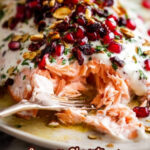 This Christmas Baked Salmon recipe features a succulent salmon side baked with a honey butter glaze, topped with a creamy dill sauce and a festive holiday tapenade of cranberries, almonds, and pomegranate seeds. Perfect for holiday celebrations, it is served warm or at room temperature with fresh lemon wedges for an elegant and flavorful main course.