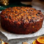 A traditional Christmas cake rich with mixed dried fruits, nuts, and warm spices, soaked in cherry brandy and slowly baked to create a moist, flavorful holiday treat. Perfect for celebrating the festive season and ideal for feeding weekly with brandy to deepen the taste.