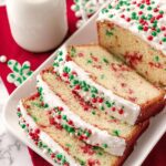 - Glaze and decorate: Spread the icing over the cooled bread evenly using a rubber spatula. Sprinkle extra Christmas sprinkles on top if desired. Let the glaze set before slicing and serving.