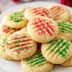 - Create Pattern and Decorate: Using a fork, press lightly into each dough ball to create a criss-cross pattern. Sprinkle the tops with red and green sanding sugar for festive decoration.