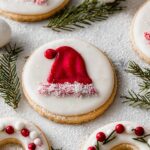 - Decorate Santa Hats: Let remaining cookies set on baking sheet. Melt white chocolate and fill a pastry bag. Mix remaining white chocolate with red oil-based food coloring and fill another bag. Pipe red chocolate in the shape of hats, add white chocolate rim and top, then sprinkle with sanding sugar. Alternatively, use green food coloring for Christmas tree shapes.