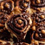 - Cool and Glaze: Let the pan cool on a wire rack for 15 minutes, then drizzle chocolate glaze over the rolls. Garnish with chocolate pearls, shavings, or sprinkles and serve warm.
