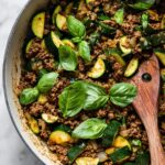 This Ginger-Basil Beef and Zucchini Skillet is a flavorful, quick, and easy stir-fry dish combining lean ground beef with fresh zucchini, aromatic ginger, garlic, and fresh basil. It's perfectly balanced with a savory and tangy sauce made from soy sauce, rice vinegar, fish sauce, and a spicy kick from Gochujang or sriracha. Great served over jasmine rice or wrapped in crisp Bibb lettuce cups, this dish is a delicious weeknight dinner option.