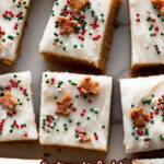 - Frost the bars: Spread the spiced cream cheese frosting evenly over the cooled bars. Optionally, sprinkle festive sprinkles on top. Refrigerate for 30 minutes to help set the frosting before slicing.