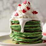 Festive Green Christmas Pancakes are fluffy and colorful pancakes infused with green food coloring and topped with a creamy cream cheese glaze, red heart sprinkles, whipped cream, and fresh fruit. Perfect for holiday breakfasts or brunches to bring a cheerful and delicious start to your day.