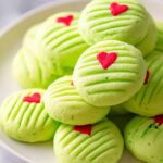 These Grinch Christmas Cream Cheese Mints are festive, vibrant green peppermint treats perfect for holiday celebrations. Made with cream cheese, butter, peppermint extract, and powdered sugar, they offer a creamy and sweet minty flavor. Decorated with red heart sprinkles, they make a charming addition to any Christmas cookie tray.