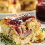 A delicious Ham and Cheese Croissant Casserole that combines flaky croissants, savory Black Forest ham, and melted Swiss cheese, soaked in a flavorful egg custard with maple syrup and spices. Perfect for a hearty breakfast or brunch, served with powdered sugar and raspberry jam for a sweet contrast.
